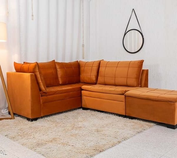 Sofá Canto 5 lugares com Puff Viena Veludo Terracota A62