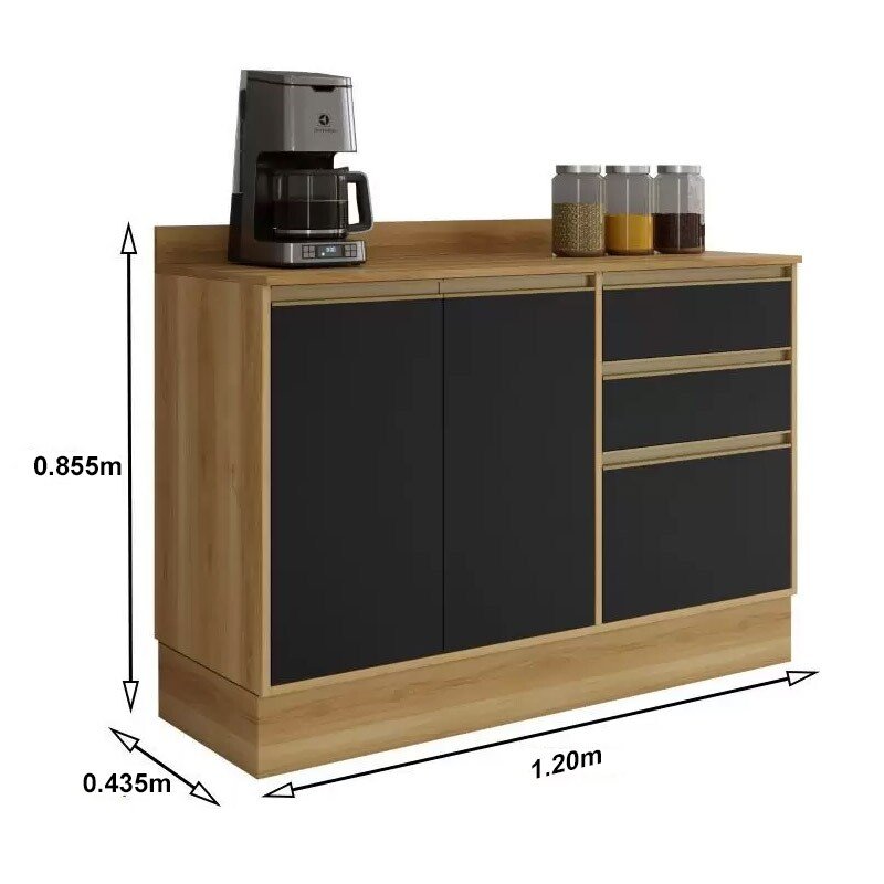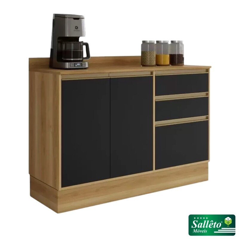 3{%%}Descrição{%%}Balcão Cozinha Barcelona Carvalho/Grafite 3 Portas 2 Gavetas Larg. 1.20m – Sallêto