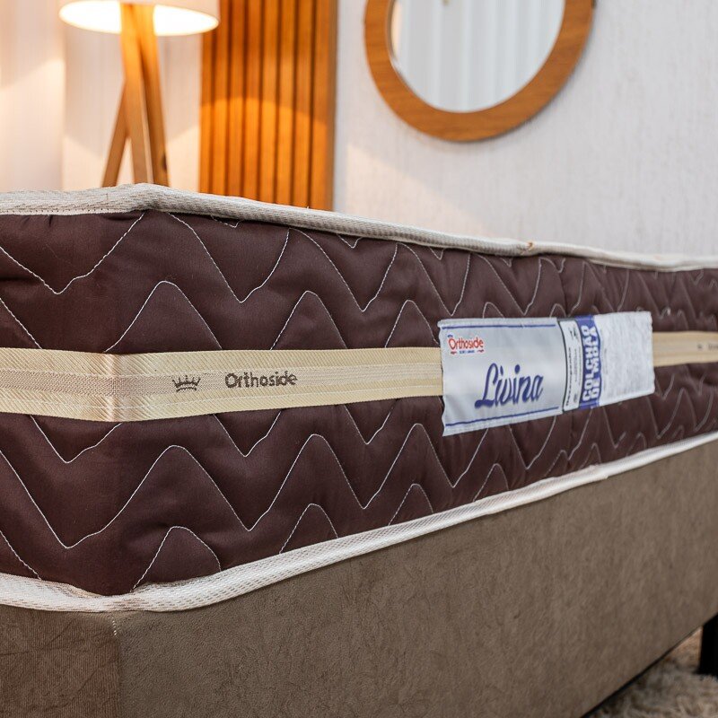 3{%%}Descrição{%%}Box Casal Sued Marrom Nosso Sonho + Colchão Casal Livina Molas Ensacadas 138x188x62 Orthoside | Suporta até 220kg