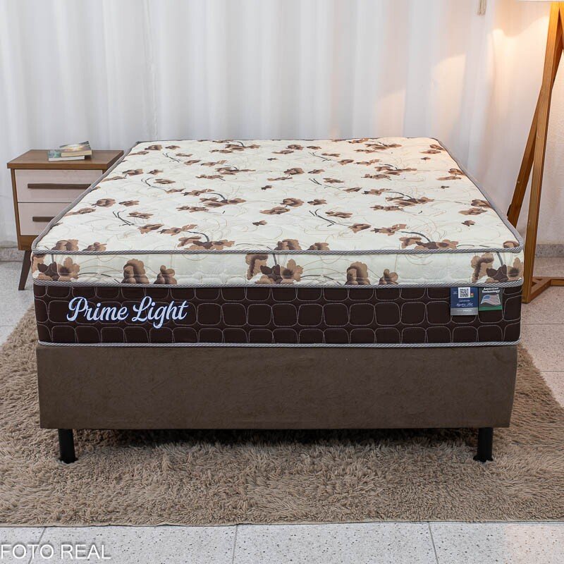 3{%%}Descrição{%%}Box Casal Sued Marrom Nosso Sonho + Colchão Casal Prime Light Marrom 138x188x67 Molas Ensacadas Orthoprime | Suporta até 240kg