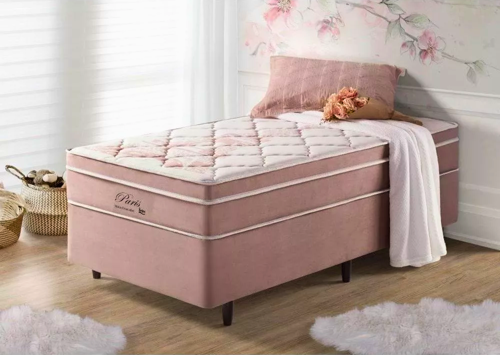 3{%%}Descrição{%%}Box Rosa + Colchão Solteiro Eiffel Molas Superlastic 88x188x68 Anjos.