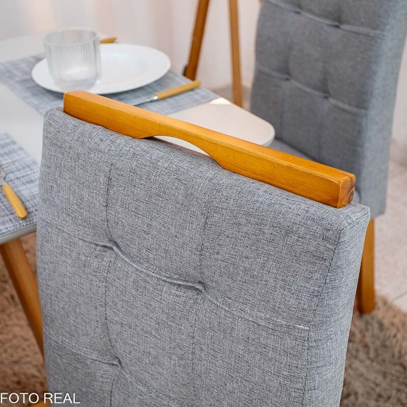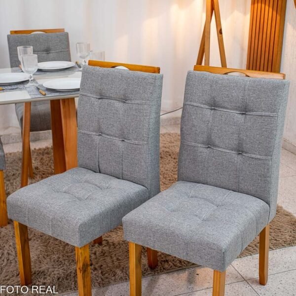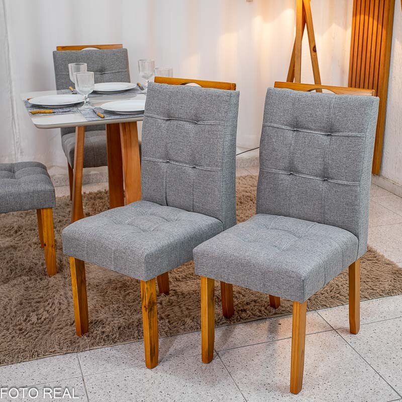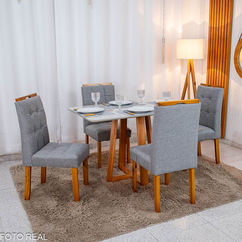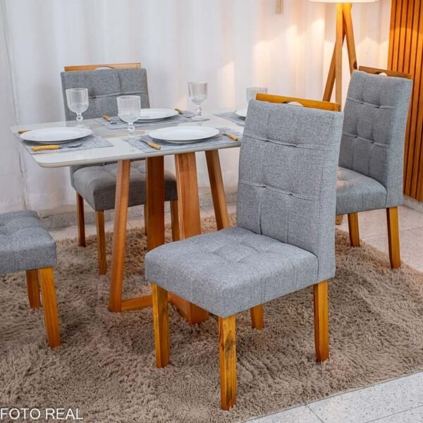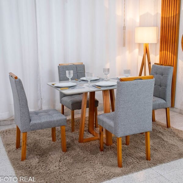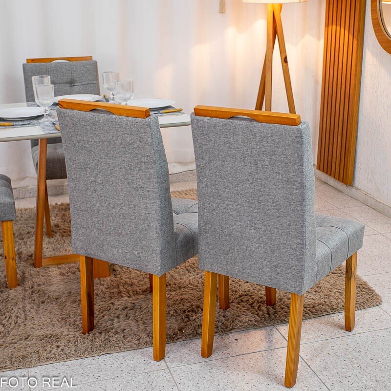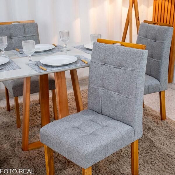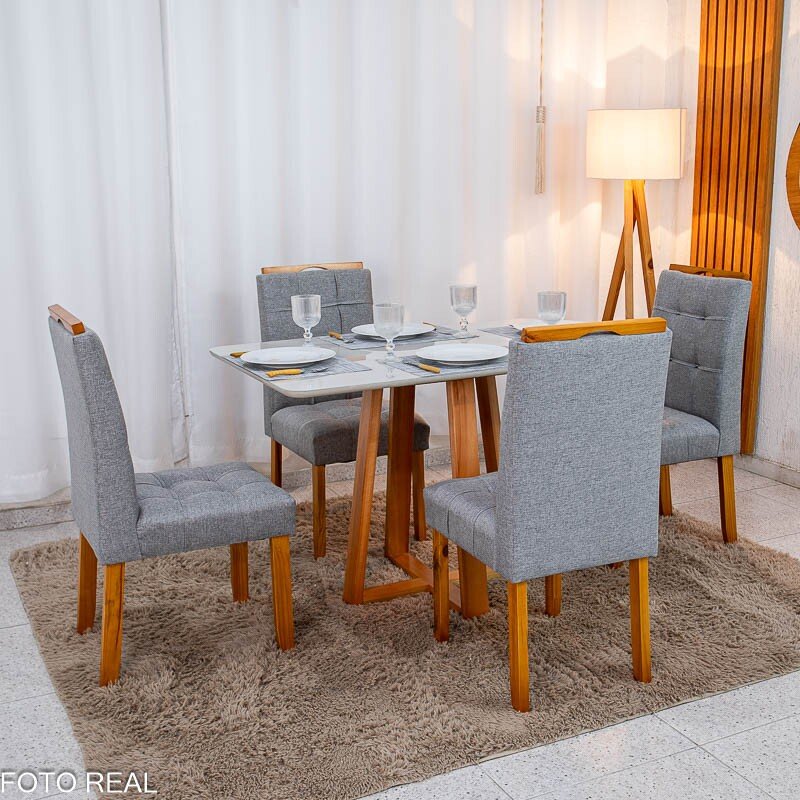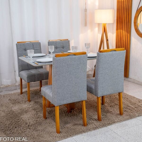 3{%%}Descrição{%%}Mesa de Jantar Bali 120×80 Vidro Off/Base Madeira + 4 Cad. Londres Linho Cinza Madeira Minas Plac – Entregue Montada