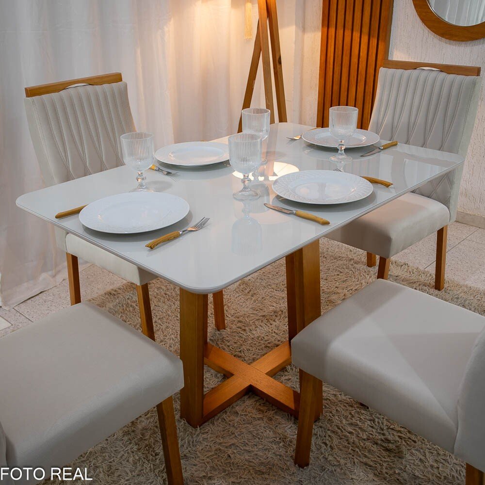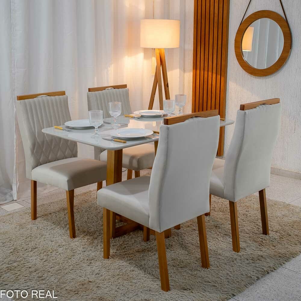 3{%%}DESCRIÇÂO{%%}Mesa Pedro Mel Vidro OFF 120×80 4 Cadeiras Genova Veludo Bege 512 Madeira Maciça Art Assento – Entregue Montada