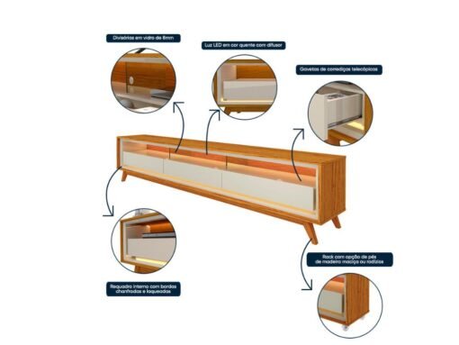 O Rack Requinte 75″ é um móvel versátil e moderno, projetado para acomodar TVs e dispositivos eletrônicos. Com um design elegante e espaçoso, oferece prateleiras e compartimentos bem distribuídos para organização. Fabricado com atenção à qualidade, se torna uma escolha estilosa e funcional para otimizar o espaço na sala de estar.