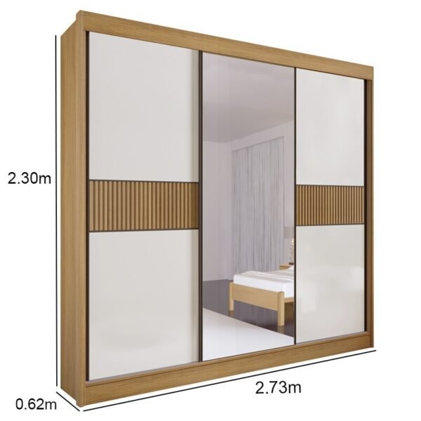3{%%}Descrição{%%}Roupeiro Casal Los Angeles Cinamomo/Off 3 Portas 6 Gavetas C/ 1 Espelho Detalhe Ripado Portas Flex 100% MDF Larg. 2.73m – D Doro