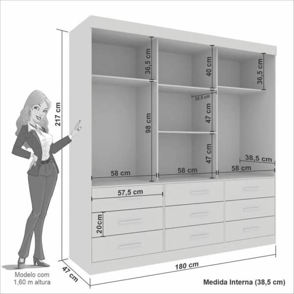 3{%%}Descrição{%%}Roupeiro New Star Cinamomo/Off 3 Portas 9 Gavetas C/ 1 Espelho Larg. 1.80m – Sallêto