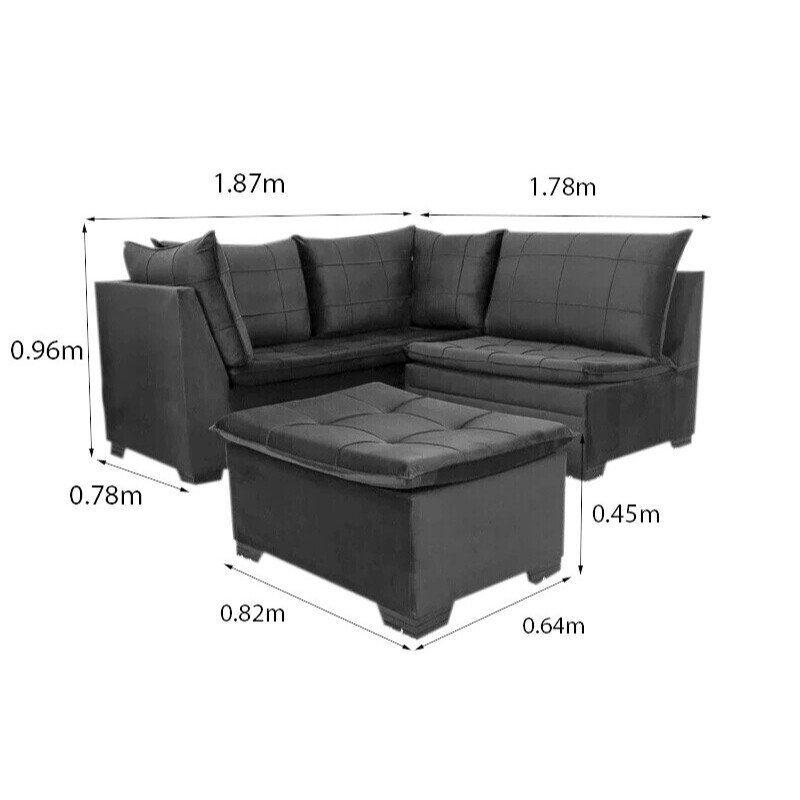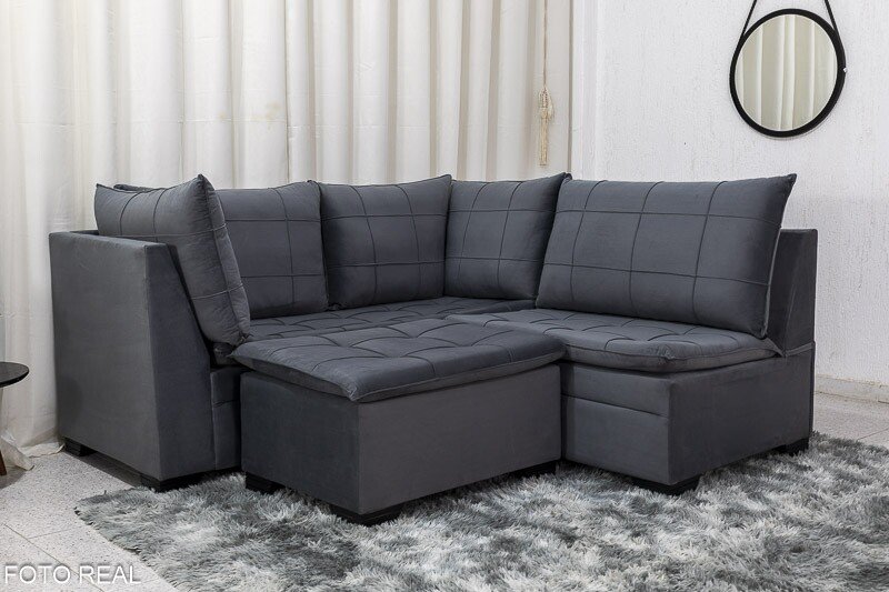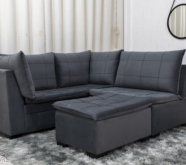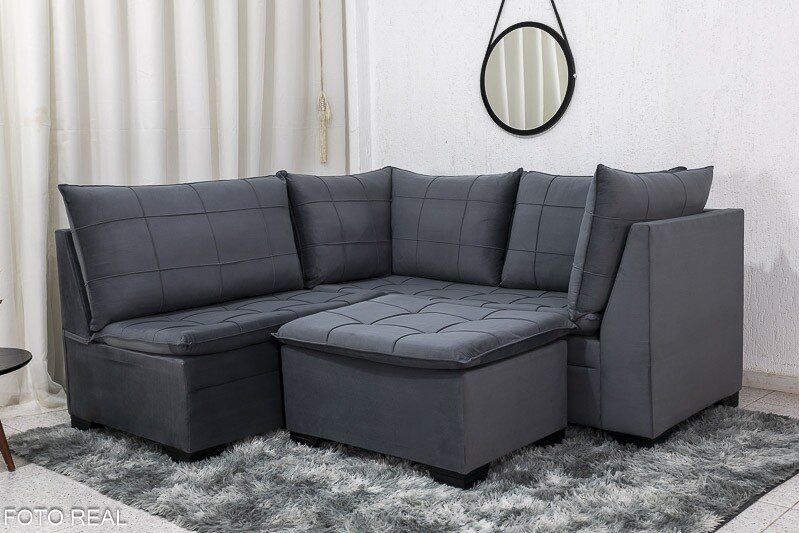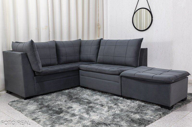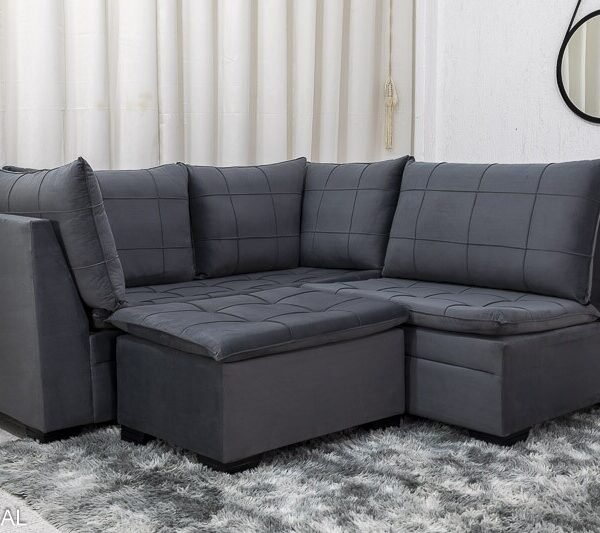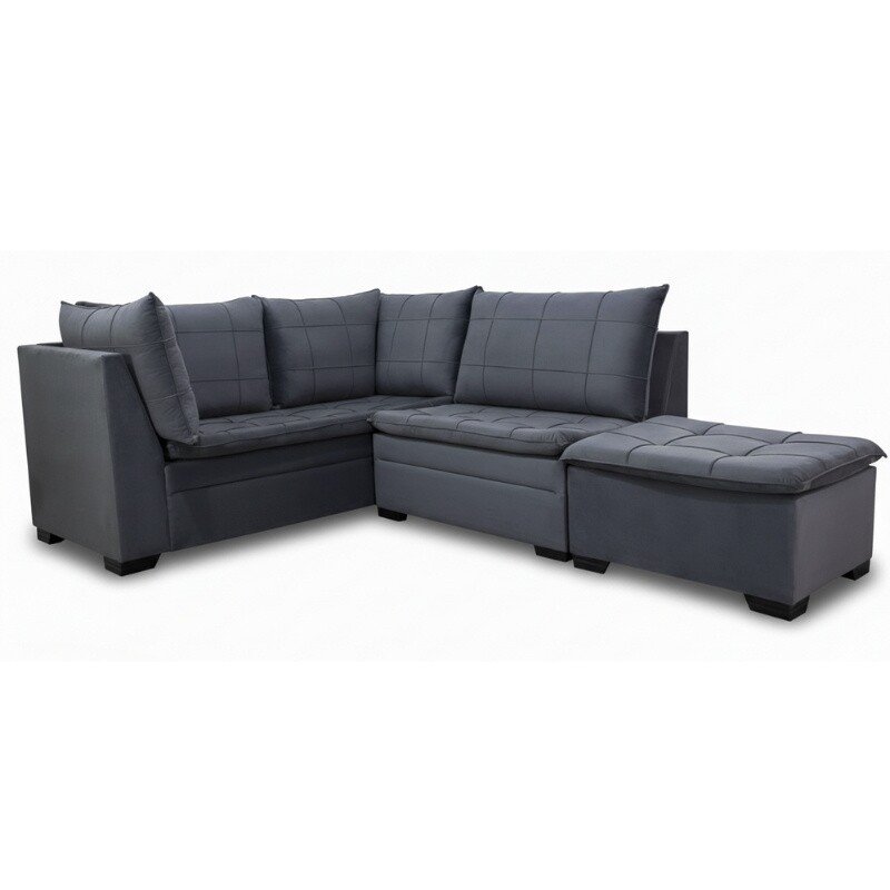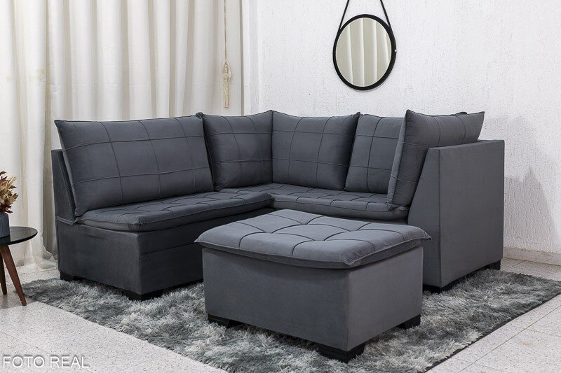 3{%%}Descrição{%%}Sofá Canto 5 lugares com Puff Viena Veludo Grafite A15