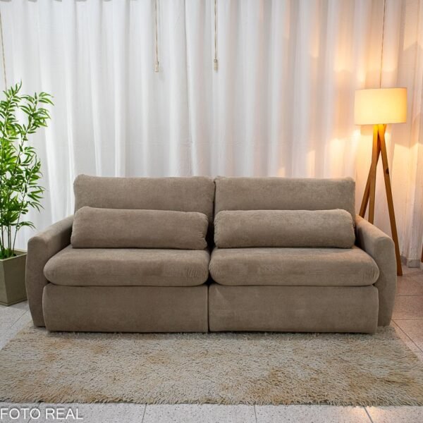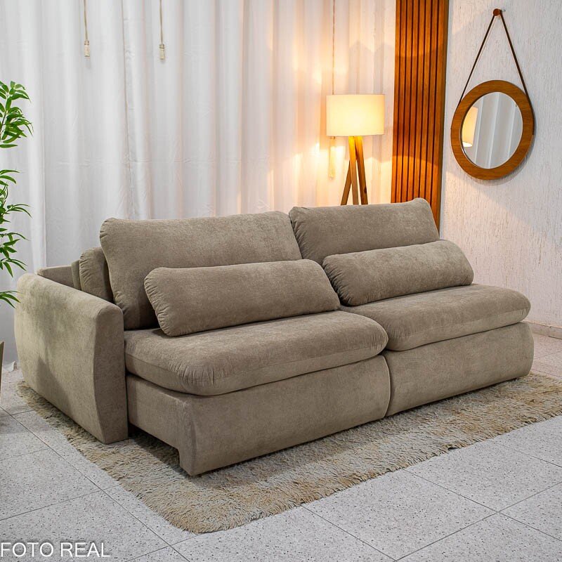 Esse modelo une conforto, praticidade e um visual elegante em um único produto. Com 2,30 metros de largura, ele acomoda bem até 4 pessoas e ainda vira uma cama espaçosa de 2,05×1,45m. ideal para receber visitas ou relaxar assistindo TV. Seu assento retrátil com pillow de 17cm e molas bonnel garante conforto mesmo por longas horas, e o encosto reclinável com almofadas soltas oferece aquele apoio extra para o corpo.