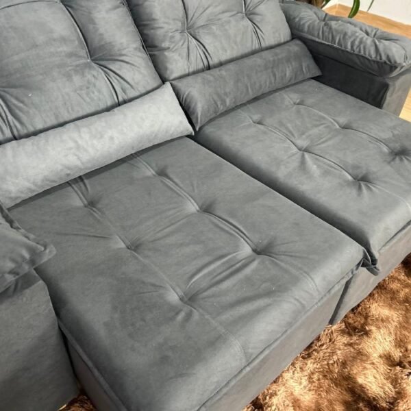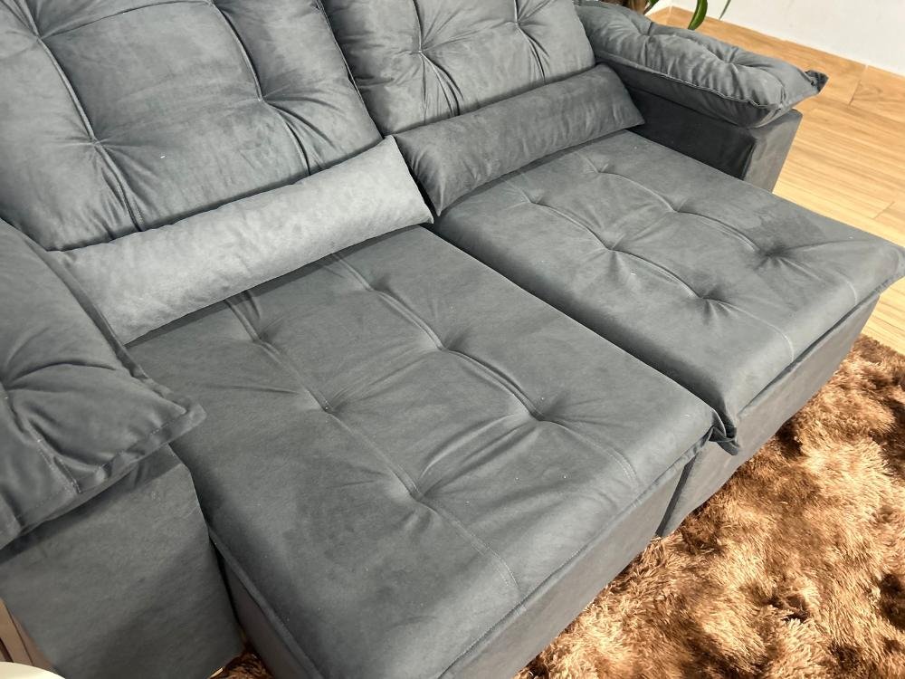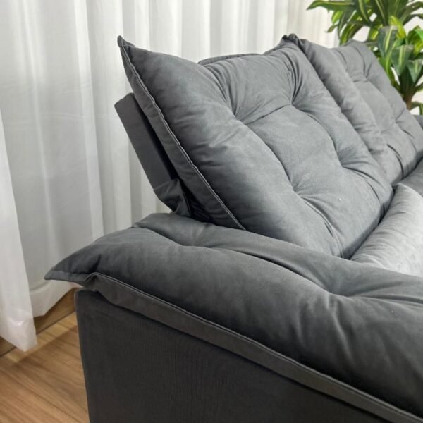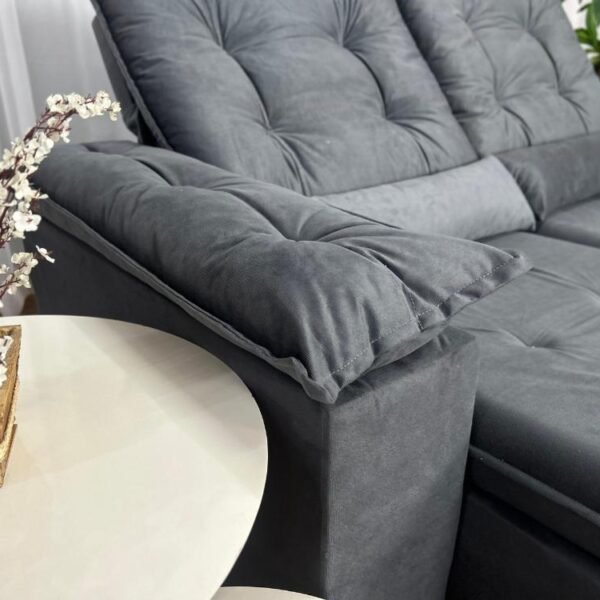 Acolchado com epsuma D26 e Super Pillow com 0,12m de altura + braços com 25cm. Encosto Possuindo 5 níveis de estágios, seus encostos são reclináveis. Suas almofadas do encosto são removíveis, podendo retira-las da base, sendo 100% fibra siliconada. *Não sentar no encosto. Tecido com um toque macio e gostoso, o tecido utilizado é o veludo.