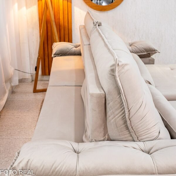 3{%%}Descrição{%%}Sofá Retrátil Reclinável Emanuelly 2.50m Veludo Capuccino 02 D28 Soft