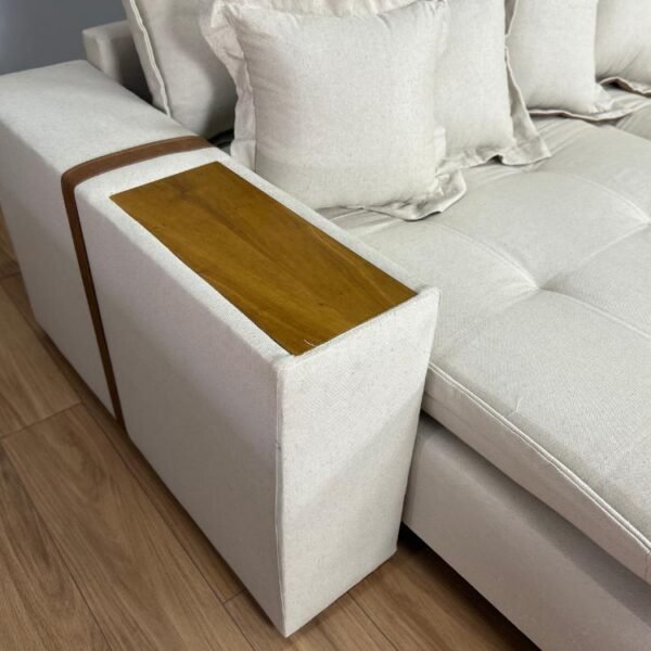 Braço com 25cm de largura, detalhes em couro e tampo de madeira no braço.