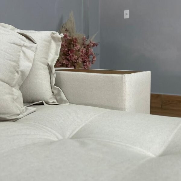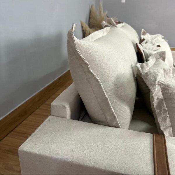 Todo revestido em linho, com detalhes em couro.