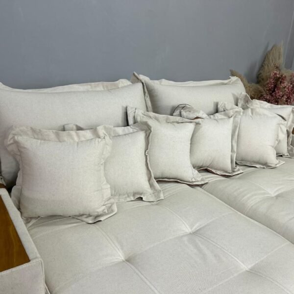 Todo revestido em linho, com detalhes em couro.