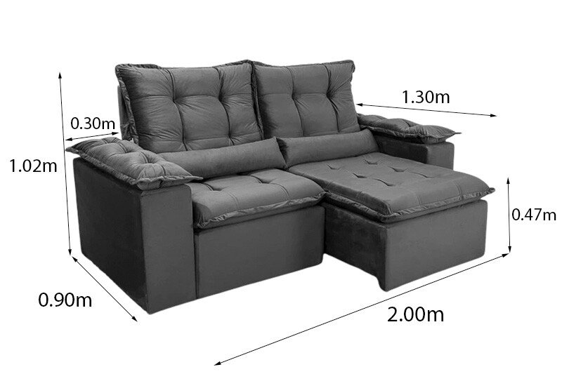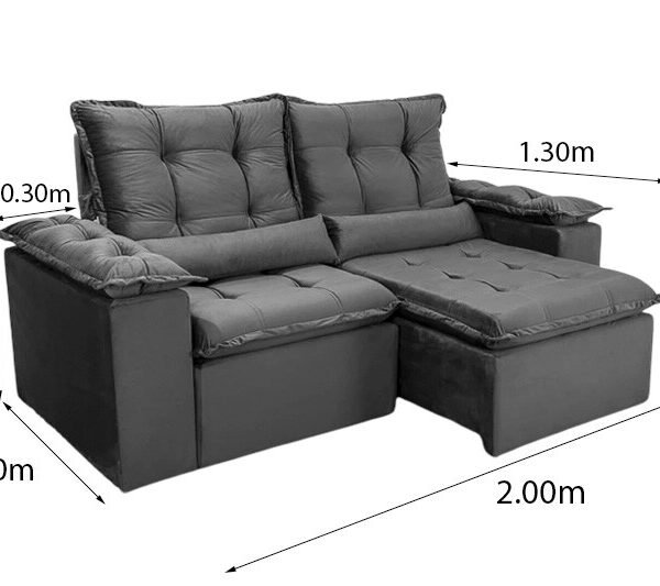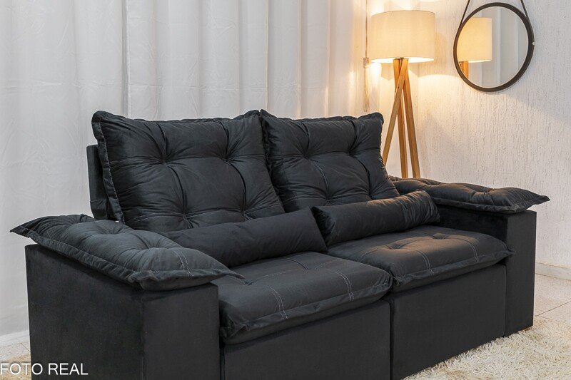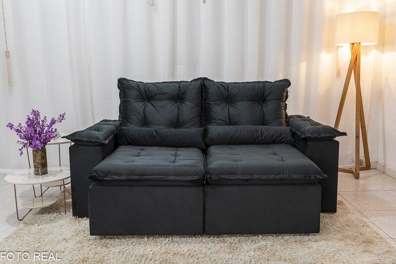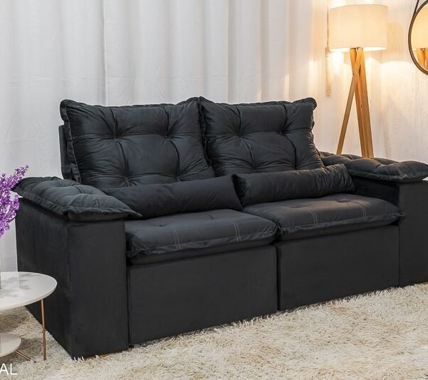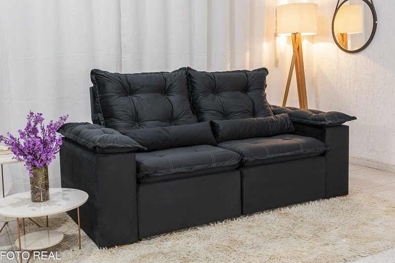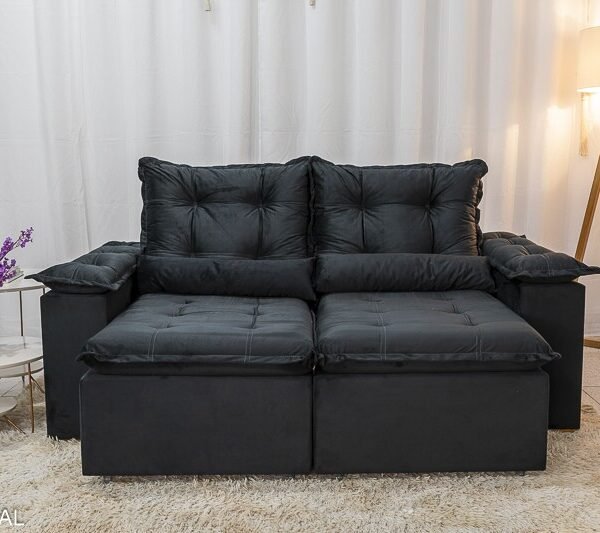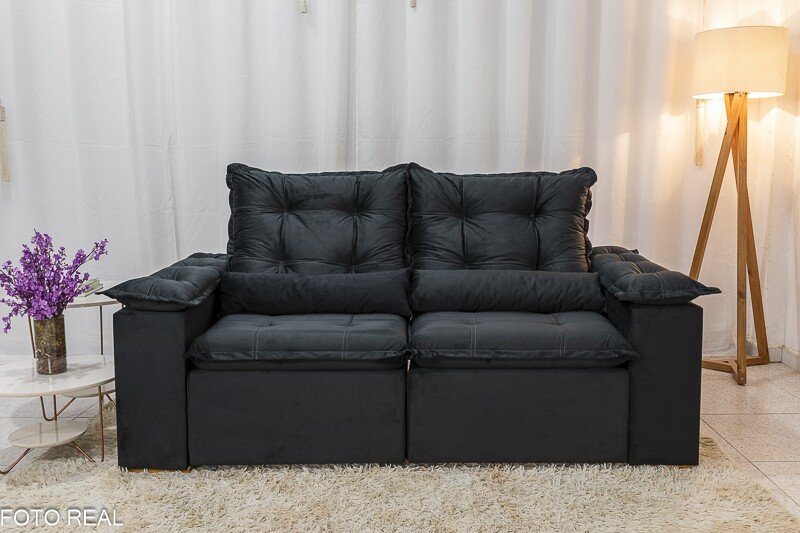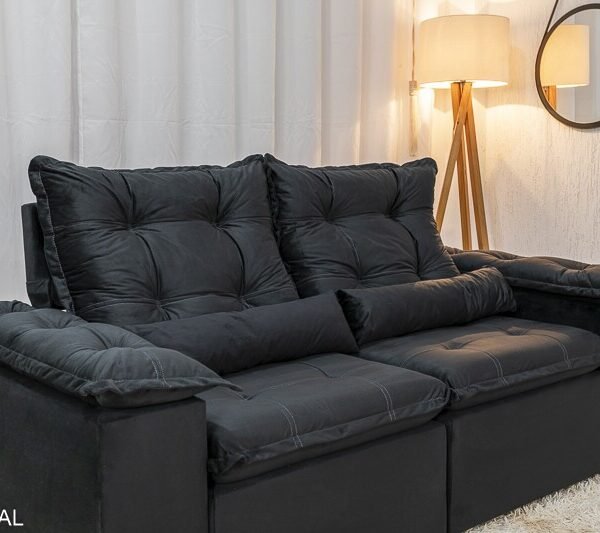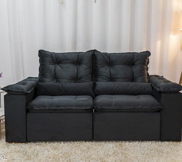 3{%%}Descrição{%%}Sofá Retrátil Reclinável Grécia 2.00m Veludo Preto – Sem caixa