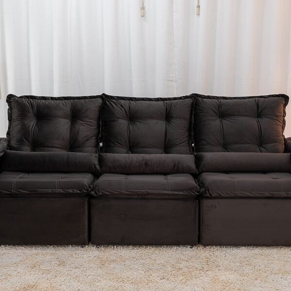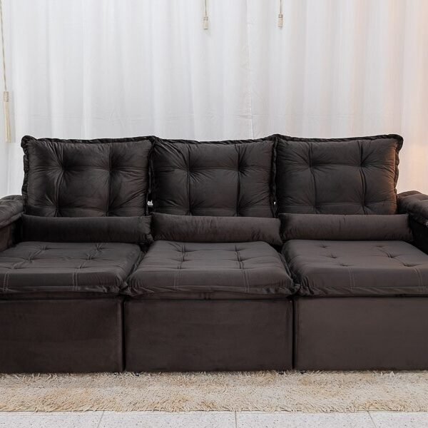 3{%%}Descrição{%%}Sofá Retrátil Reclinável Grécia 2.70m Veludo Marrom – Sem Caixa