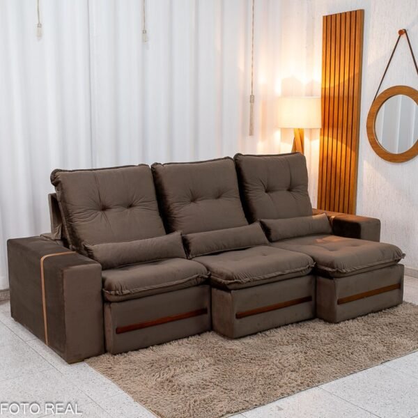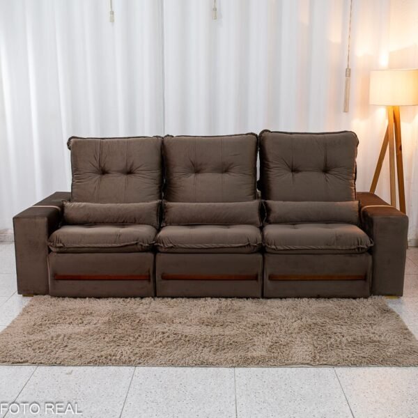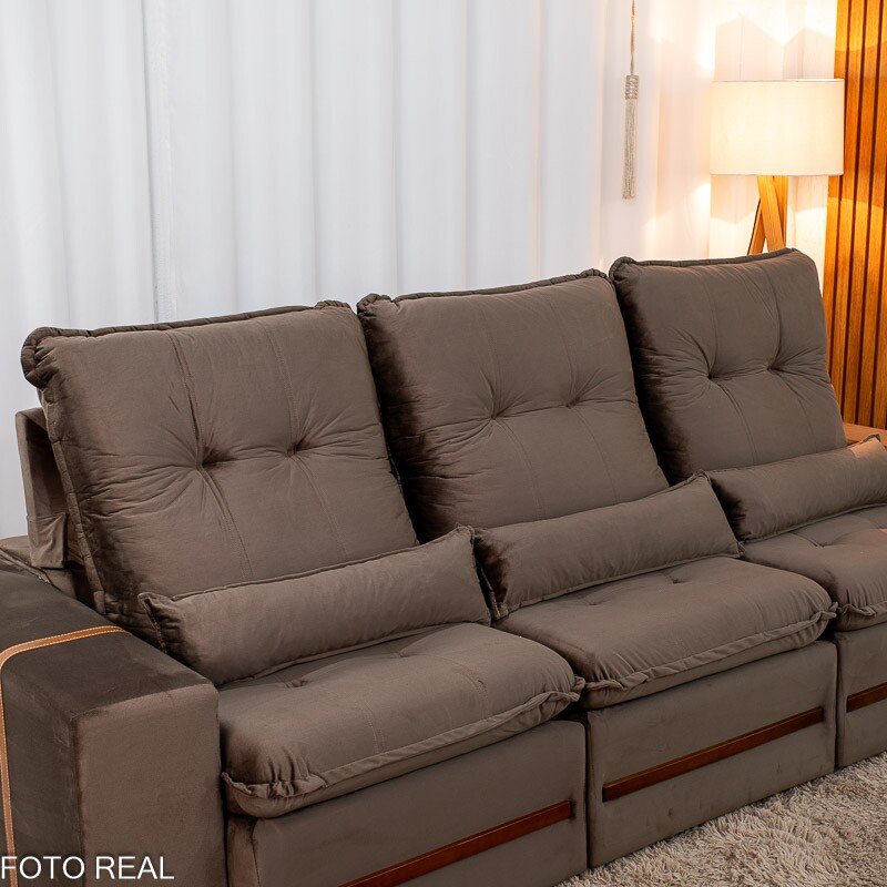 3{%%}Descrição{%%}Sofá Retrátil Reclinável Montreal 2.60m Veludo Marrom – D33