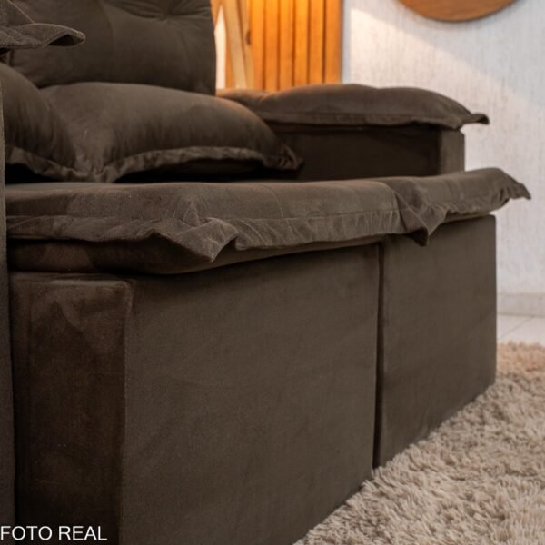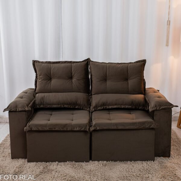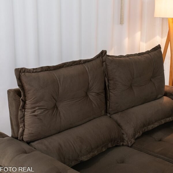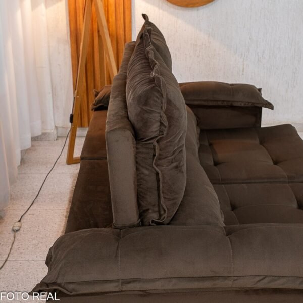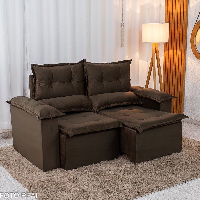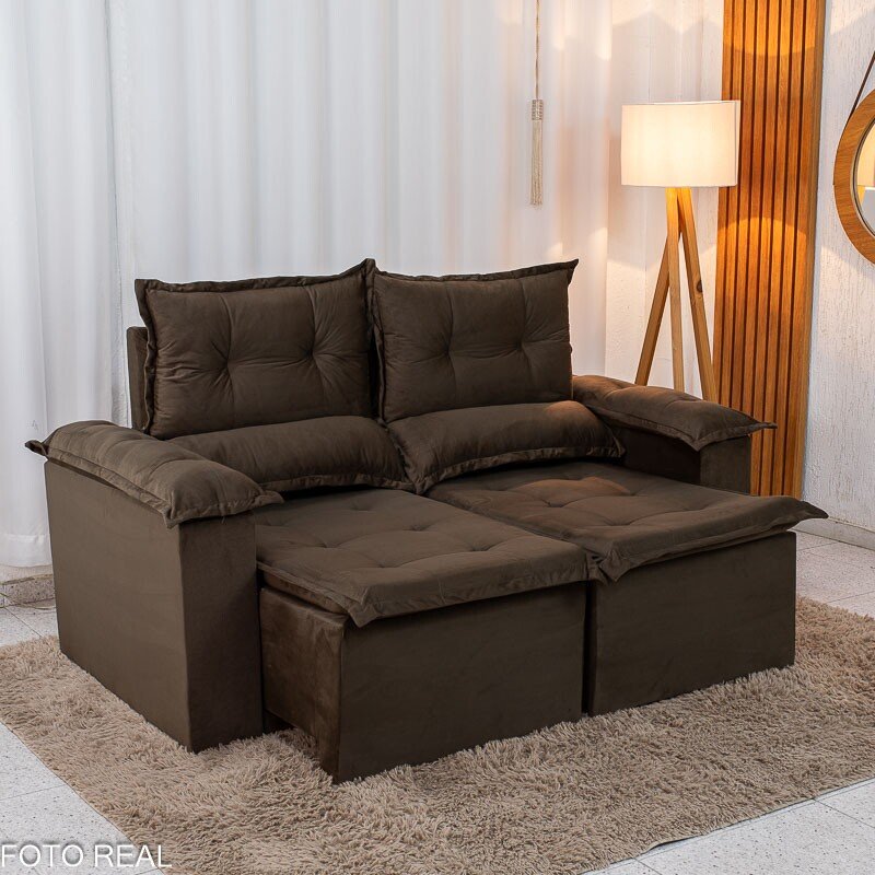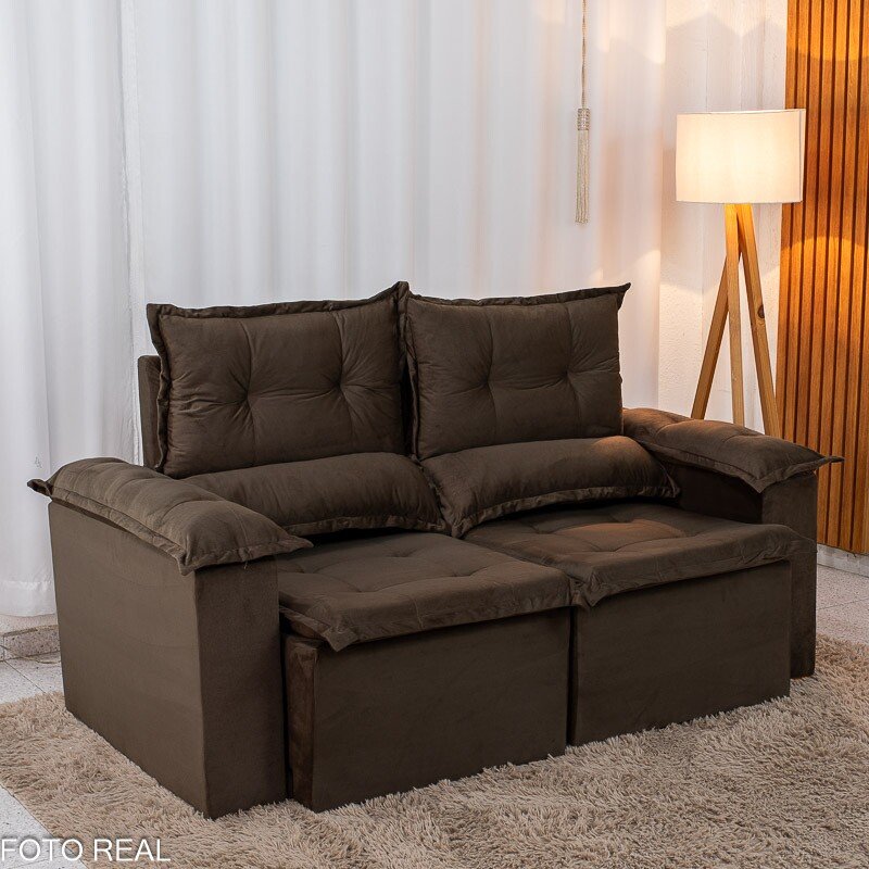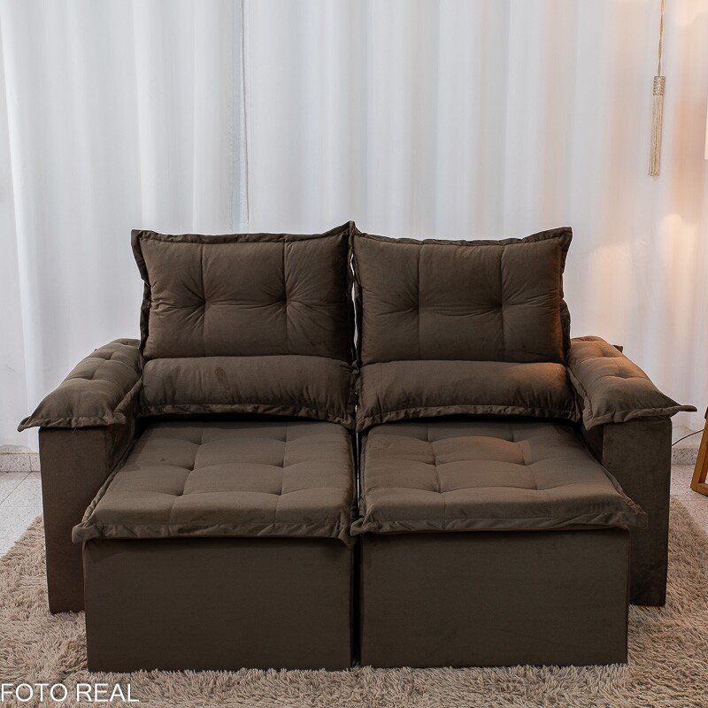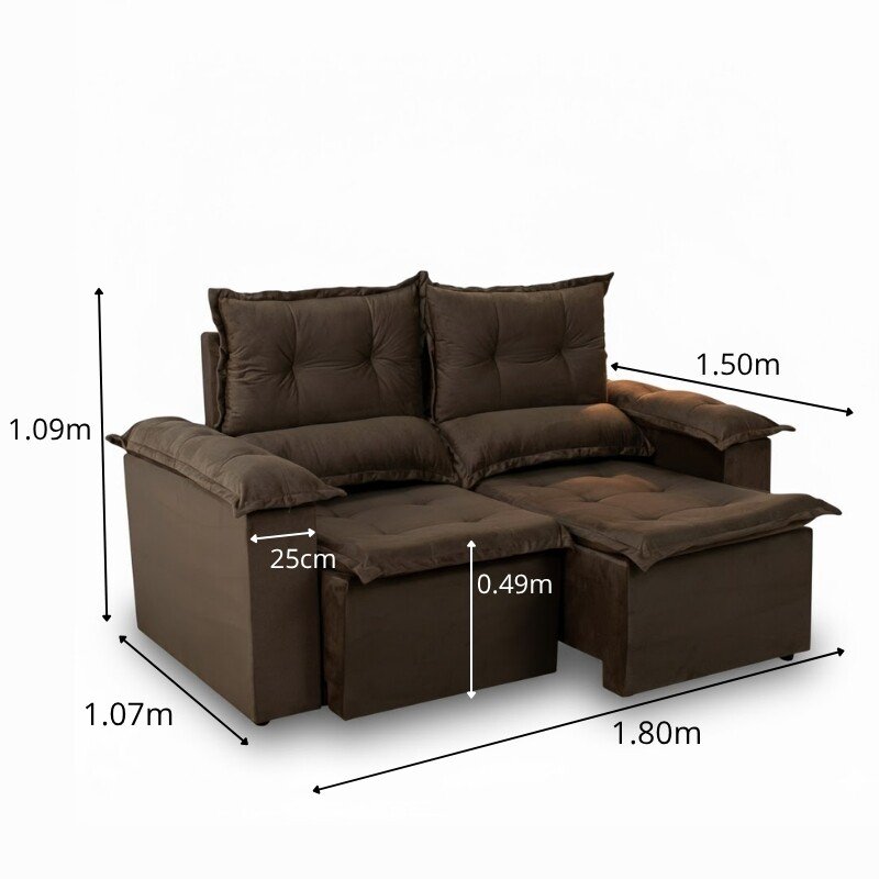 3{%%}Descrição{%%}Sofá Retrátil Reclinável Nicole 1.80m Veludo Marrom A17 S/Rineiras