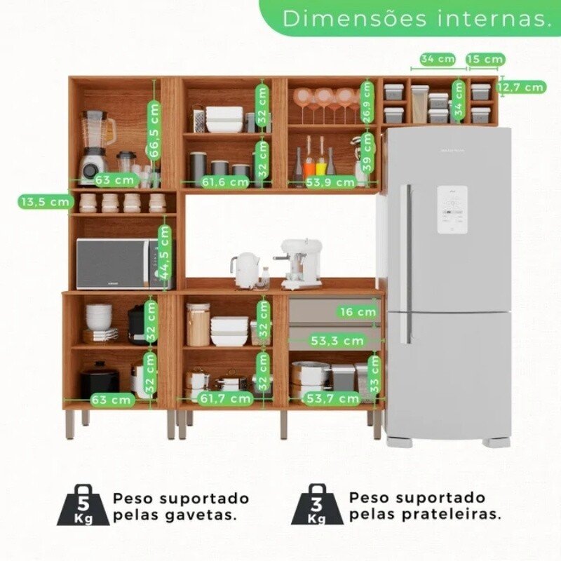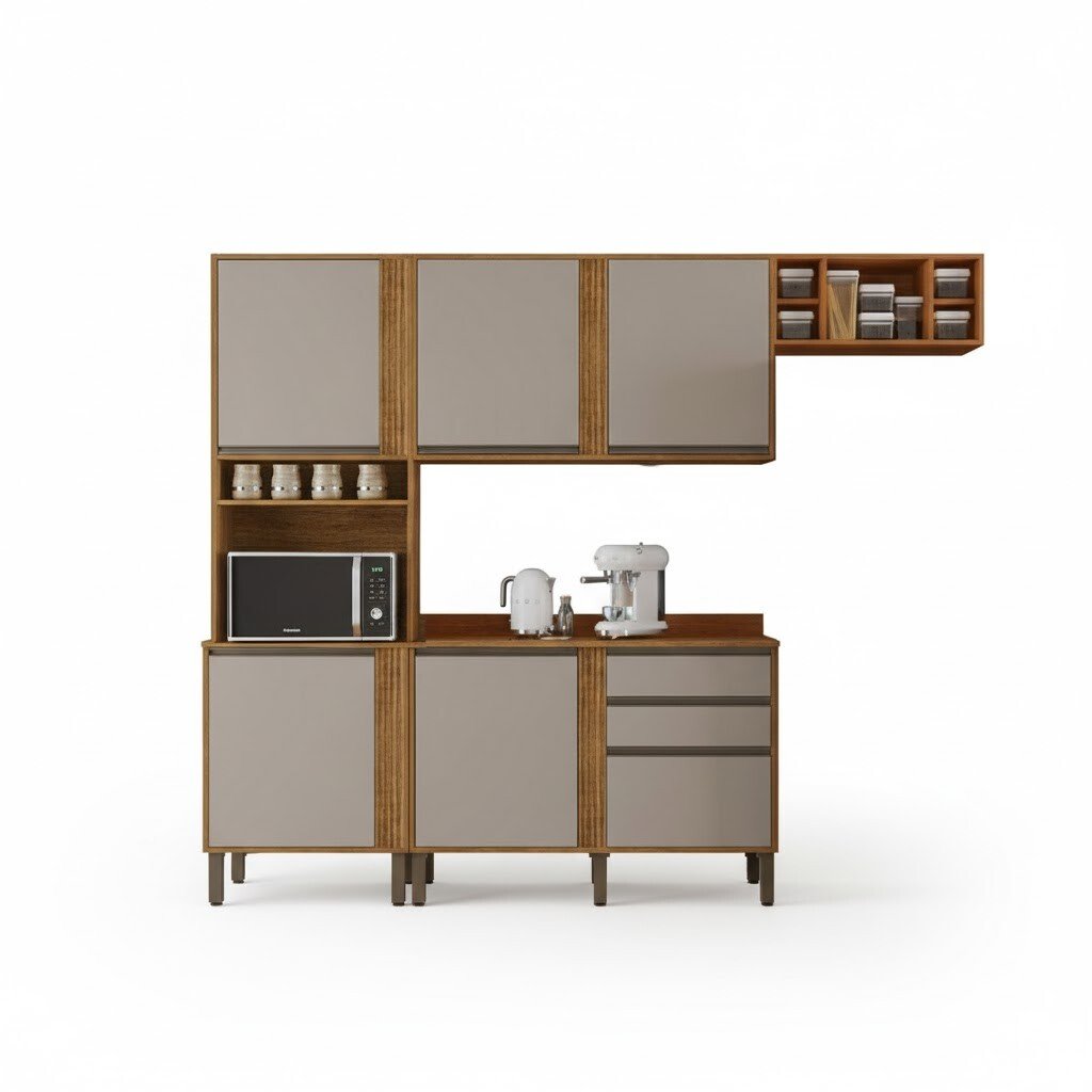 3{%%}Descrição{%%}Torre Quente Cozinha Pérola + Balcão 1.20m + Aéreo 1 Portas 1.20m + Armário de geladeira Pérola Cinamomo/Off Sallêto