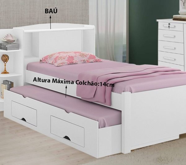 Cama Auxiliar solteiro com 2 gavetas – Branco