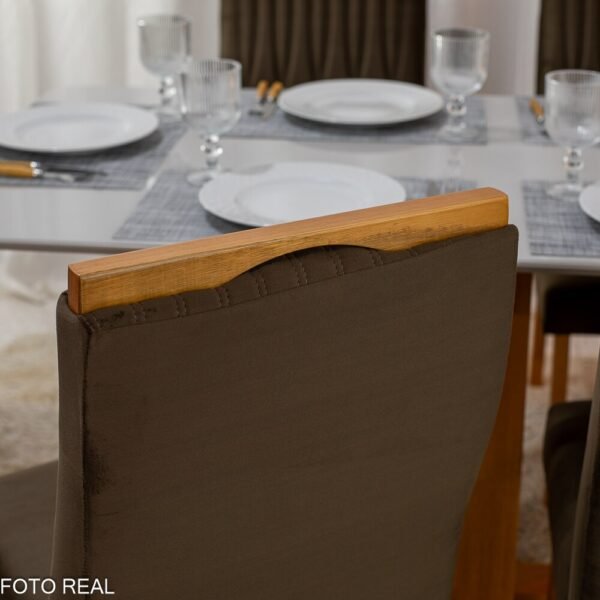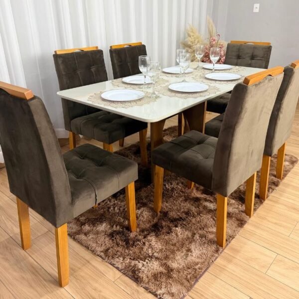 Mesa de Jantar Pedro 160×80 Vidro Off/Base Madeira + 6 Cad. Lisboa Veludo Marrom 509 Madeira Art Assento – Entregue Montada