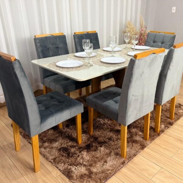 Mesa de Jantar Bali 160×80 Vidro Off/Base Madeira + 6 Cad. Londres Veludo Prata Madeira Minas Plac – Entregue Montada