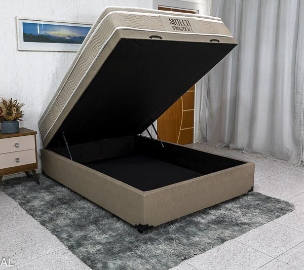 Box Baú Casal Eli Korino Bege Blindado + Colchão Casal Airtech Springpocket 138x188x67 Ortobom
