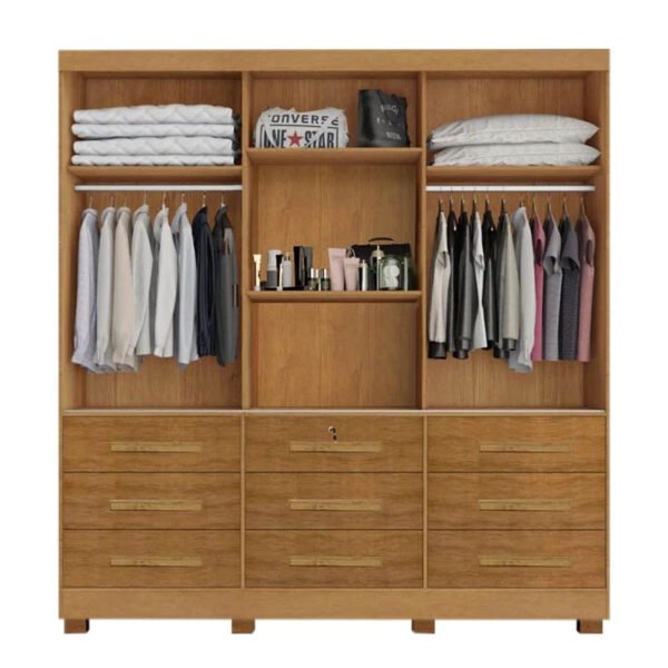 Roupeiro Casal Athenas Nature 3 Portas 9 Gavetas C/ Espelho e Pés 100% MDF Larg. 1.80m – Bianchi