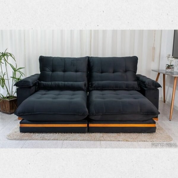 Sofá Retrátil Ibis 2.30m Veludo Preto 820 + Mesa Pedro Mel Tampo Vidro Preto 90×90 4 Cad. Lisboa Veludo Preto 504