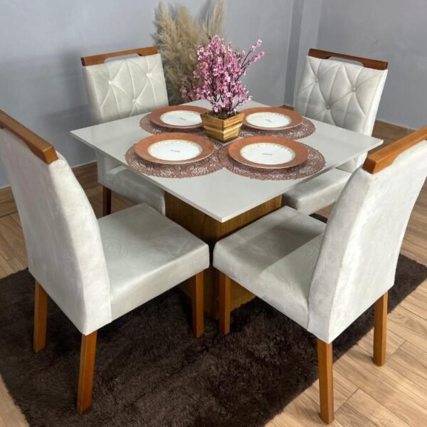 Mesa de Jantar Dakota Plus 90×90 c/ 4 Cadeiras Jasmim – Cinamomo/Off White/Bege Veludo